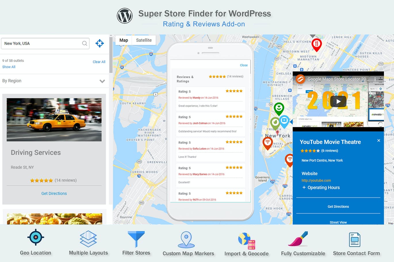 Este é um complemento para o Google Maps Store Locator for WordPress, que permite que seus visitantes públicos ou membros do WordPress deixem classificações de lojas e comentários em seu localizador de lojas. Super Store Finder para WordPress é um Plugin WordPress totalmente caracterizado integrado com a mais recente API do Google Maps que permite que os clientes para localizar suas lojas facilmente. Feito sob medida com design responsivo intuitivo para smartphones, tablets e dispositivos de tela sensível ao toque. Ele tem poderoso administrador localizador de lojas que permite gerenciar lojas, tags/categorias e personalizar estilos, cores, rótulos, notificações, regiões e configurações de mapa.