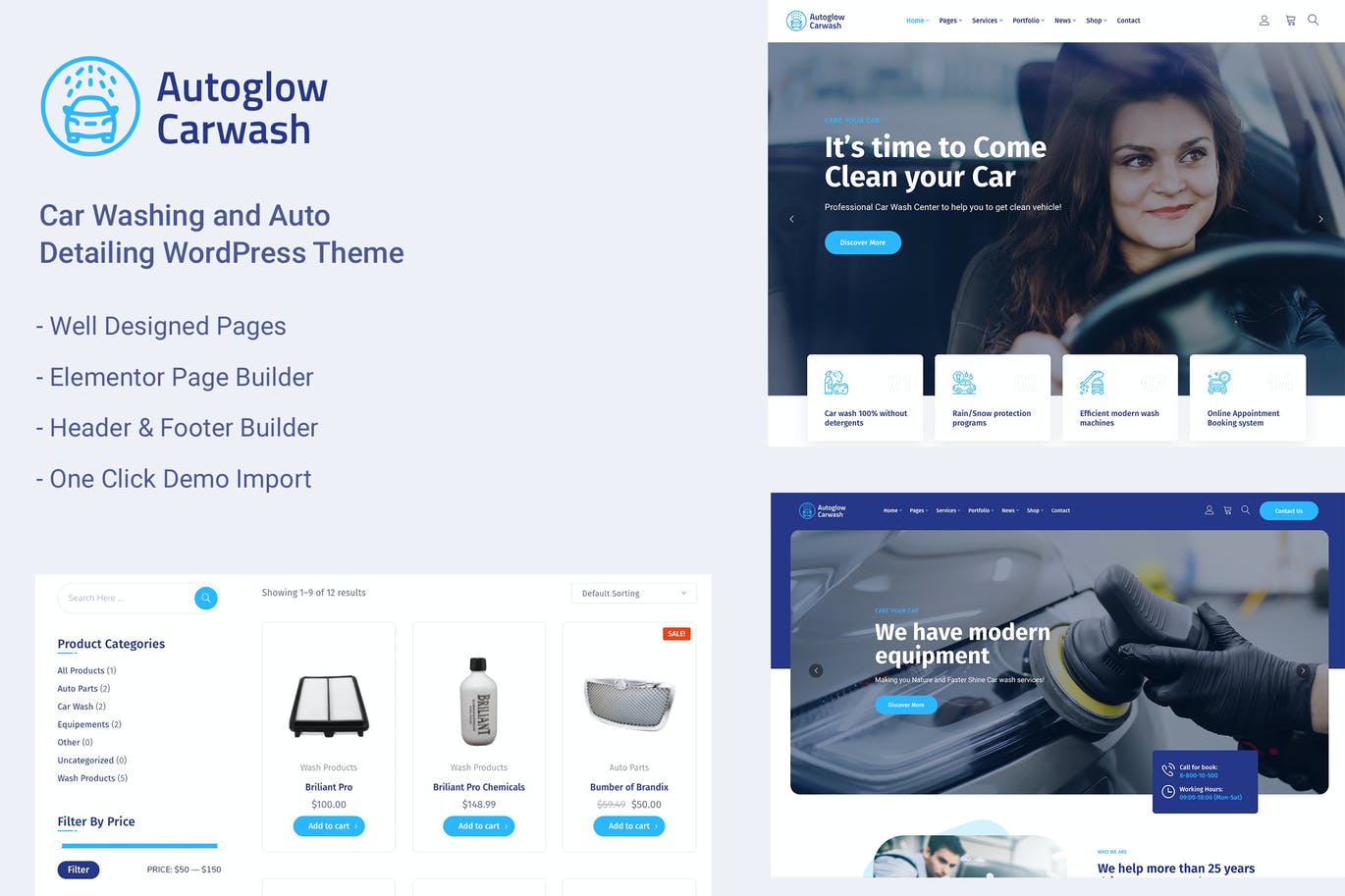 Autoglow é um tema para serviço de lavagem de carros Autoglow é criado para lavagem de carros, lavagem de carros e serviço de manutenção de automóveis. Você também pode criar sites para revendedores de automóveis, decorações de automóveis, revistas de automóveis, trabalhos de pintura automática. O Autoglow Car Wash causa uma ótima primeira impressão em cada cliente em potencial porque seu design parece profissional e claro, além de oferecer todos os recursos essenciais para um site de serviço de lavagem de carros. Além disso, o tema é fácil de usar e altamente personalizável sem nenhum conhecimento de codificação.