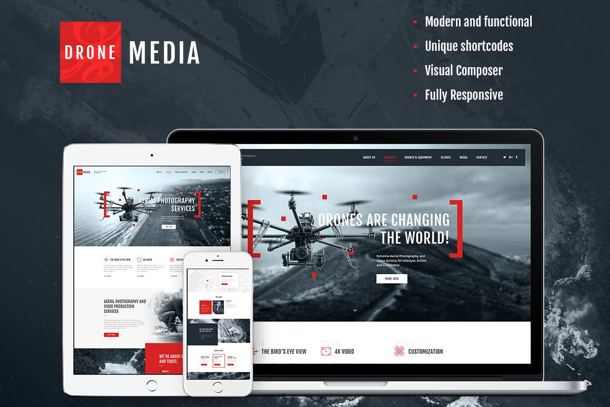 Drone Media é um novo, elegante e moderno Modelos WordPress. É focada na fotografia aérea e na videografia. O design tem toque e sensação modernos, e oferece um pacote completo de opções para descrever seus serviços e expor todos os seus projetos. É perfeito para aqueles que lidam com tiro de fotos, gravação de vídeo, agência de eventos com serviços de operador de câmera. Ele funciona tanto para negócios corporativo e organização privada.
